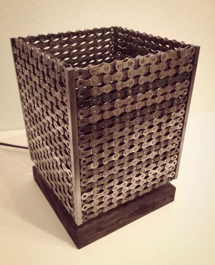This is a lamp I made from old chains. It was a lot of work – it’s completely handmade – but it was absolutely worth the effort. I used bike chains, steel and wood to create this decorative lamp. The chains are carefully welded and the base is sawn, planed and finished by hand. I love the beautiful shadow which you can see when you turn the light on.